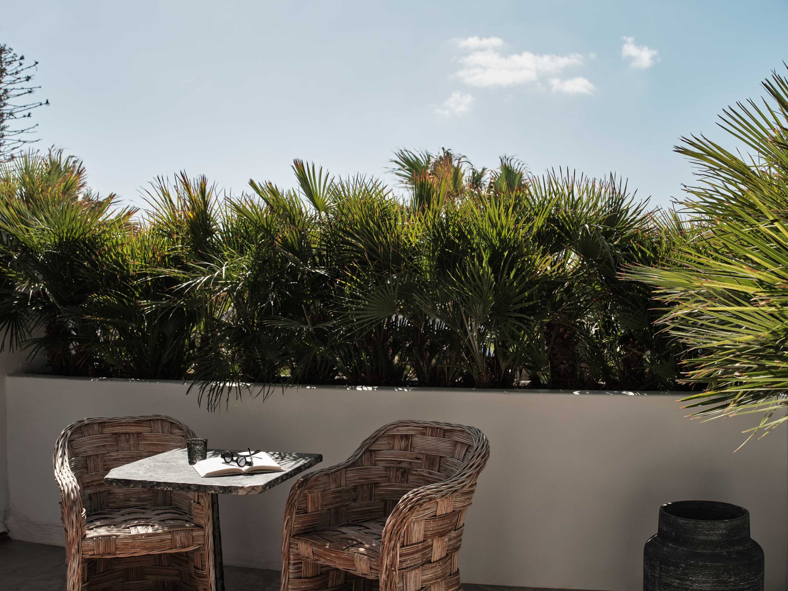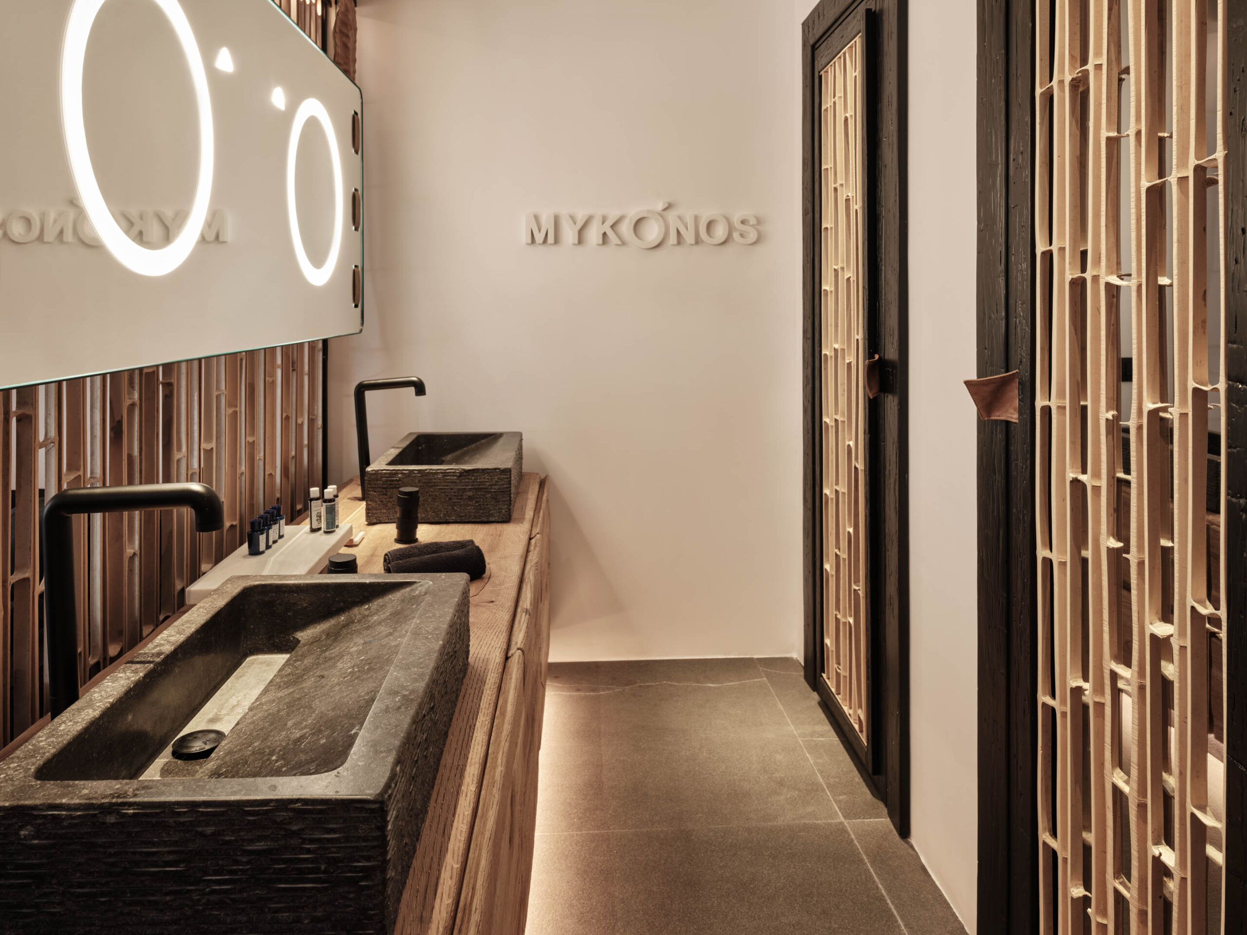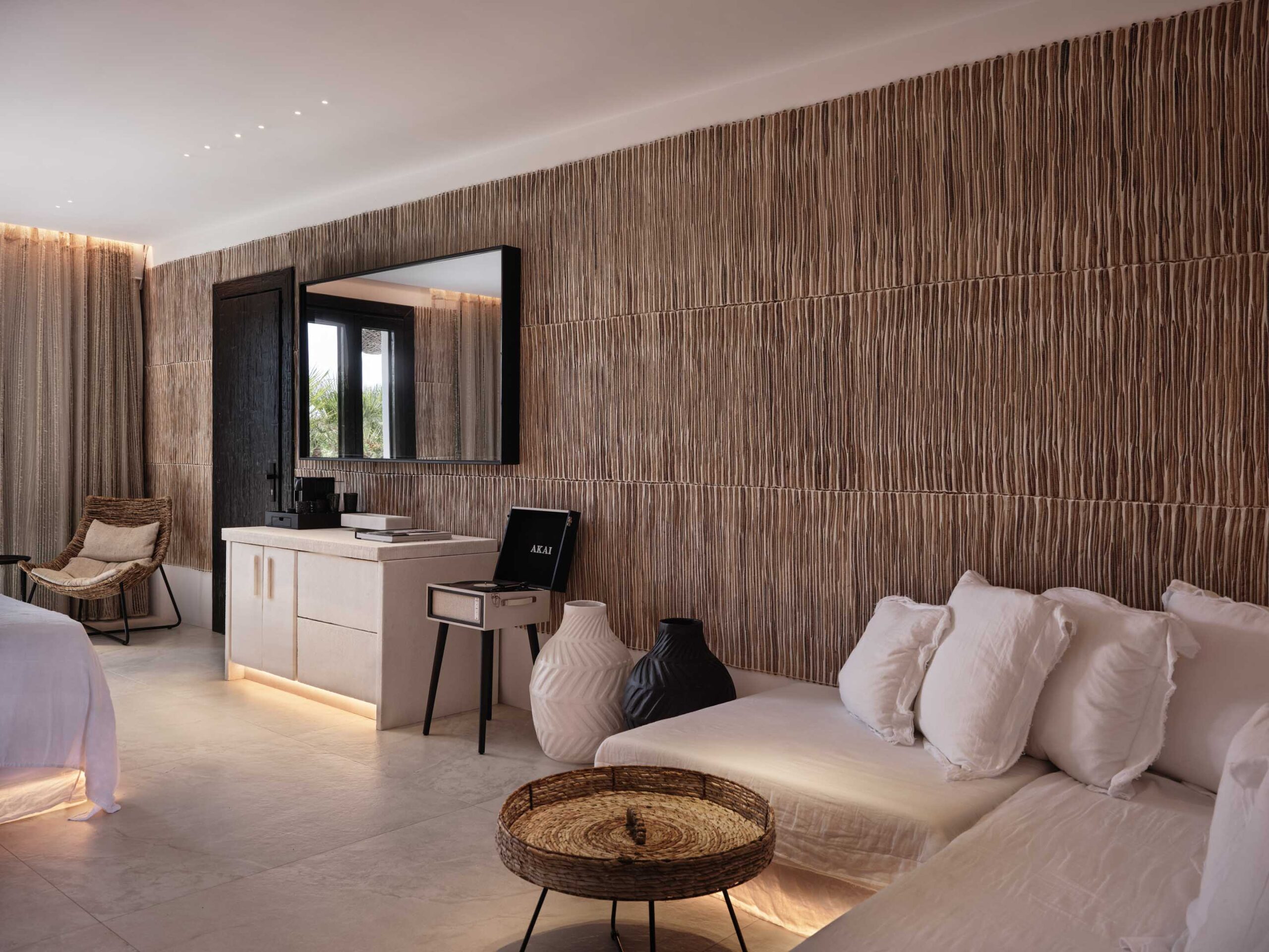 The generous open plan suite seduces with honed stone floors, dark woods and artisanal linens, offset against the pure whites of the Aegean vernacular. Supremely comfortable mattresses offer the option of either twin beds or a European king-size, and the sofa in a spacious seating area with a desk can convert to sleep a third guest at a premium. The furnished balcony is the perfect perch for the day’s first espresso or to steal one last glance at the night sky. Naturally, every comfort is assured, from soundless air-conditioning to double glazing, black-out blinds, hi-tech features, and discreet housekeeping that includes a turndown service.