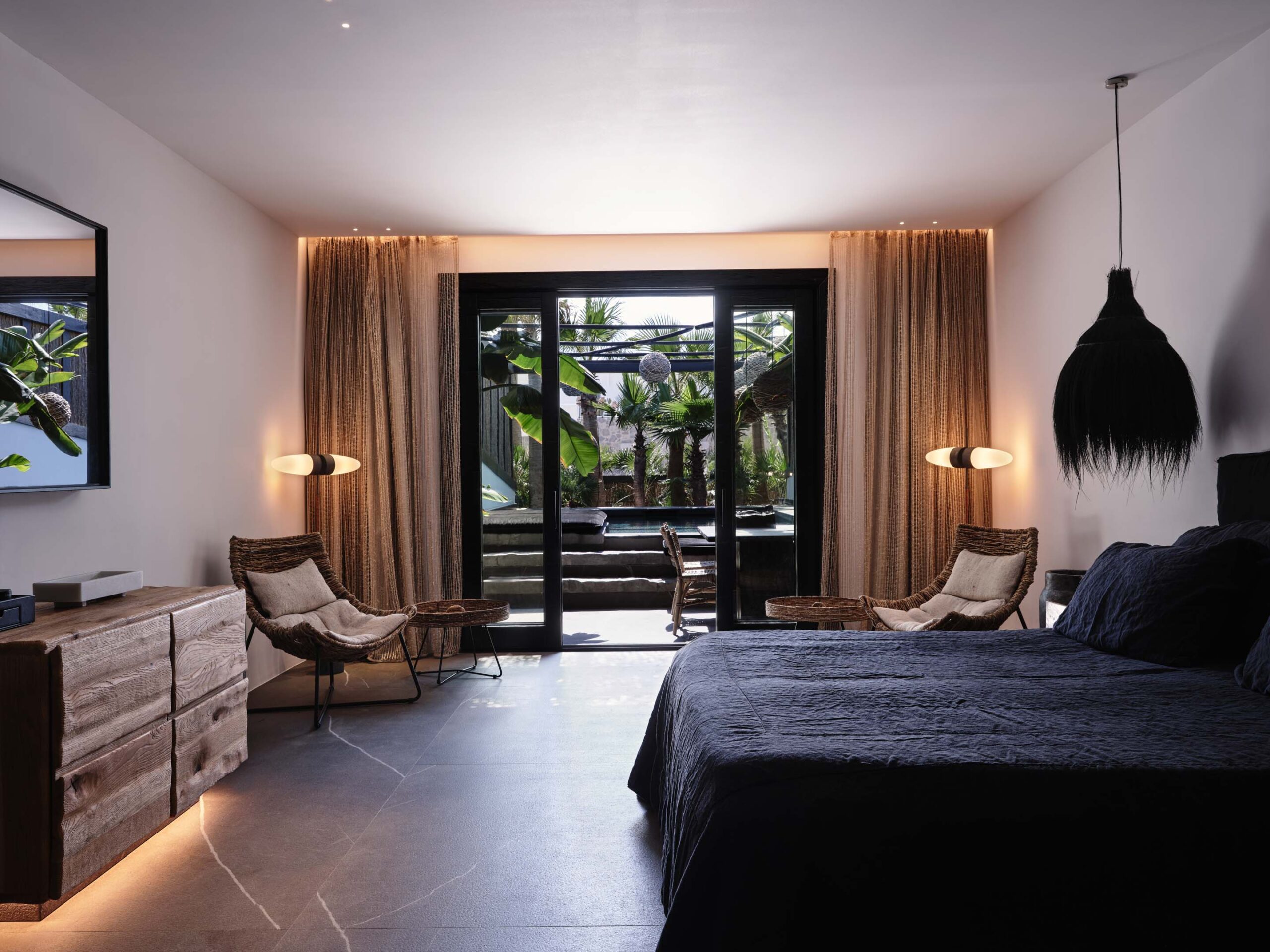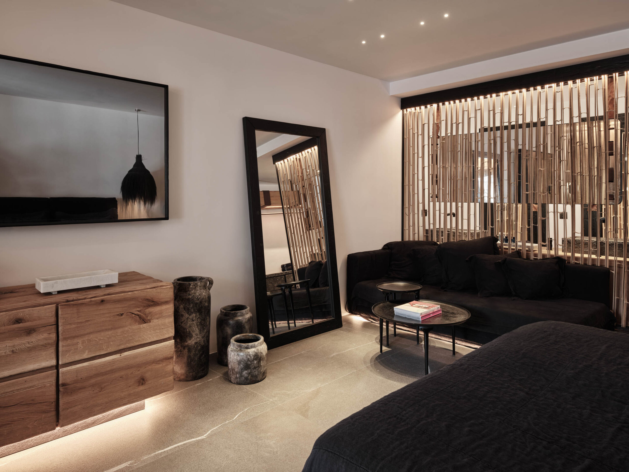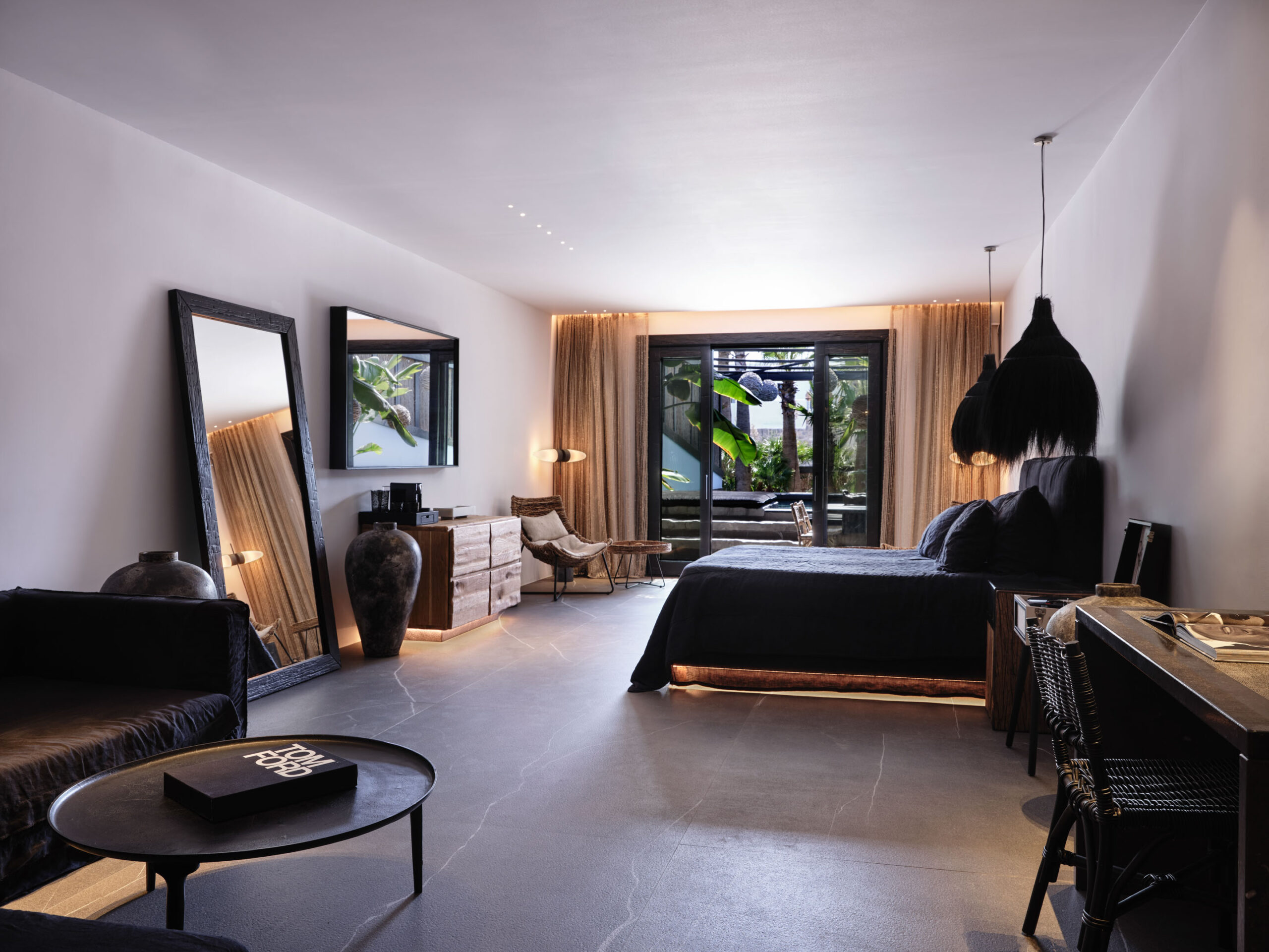 The generous open plan suite seduces with honed stone floors, dark woods and artisanal linens, offset against the pure whites of the Aegean vernacular. Supremely comfortable mattresses offer the option of either twin beds or a European king-size, and the sofa in a spacious seating area with a desk can convert to sleep a third guest at a premium. The furnished balcony is the perfect perch for the day’s first espresso or to steal one last glance at the night sky. Naturally, every comfort is assured, from soundless air-conditioning to double glazing, black-out blinds, hi-tech features, and discreet housekeeping that includes a turndown service.